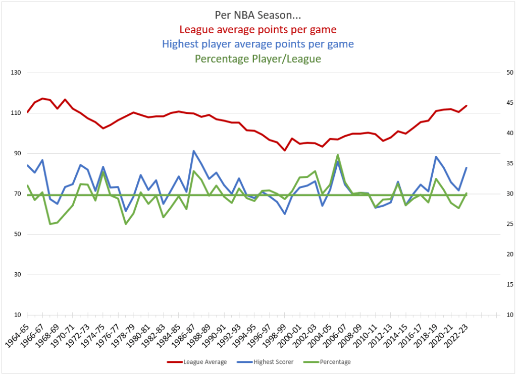 The red line is the average amount of points that a team scored during a given season (left axis). The blue line is the amount of points that the league leader scored per game (right axis). The green line is the percentage of points that the league leader scored in relation to the average amount of points that the team scored.