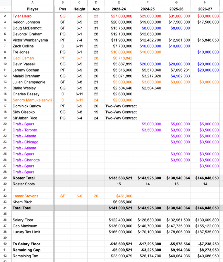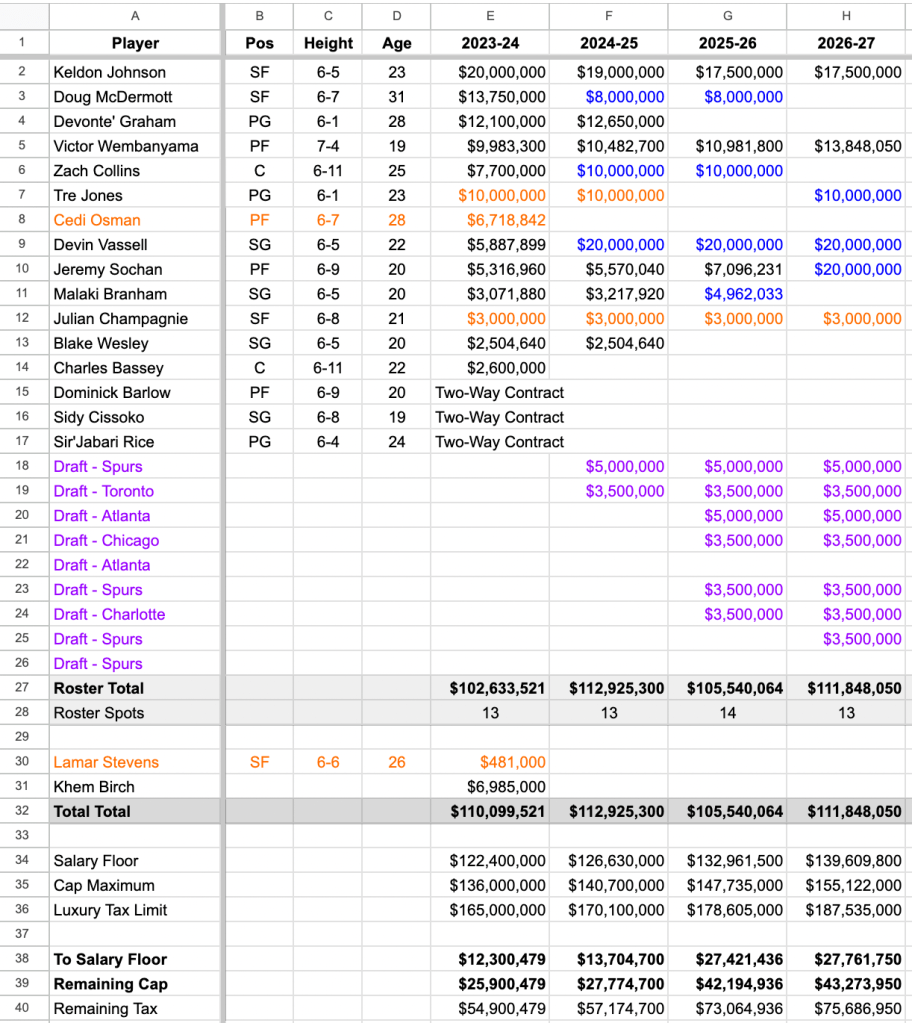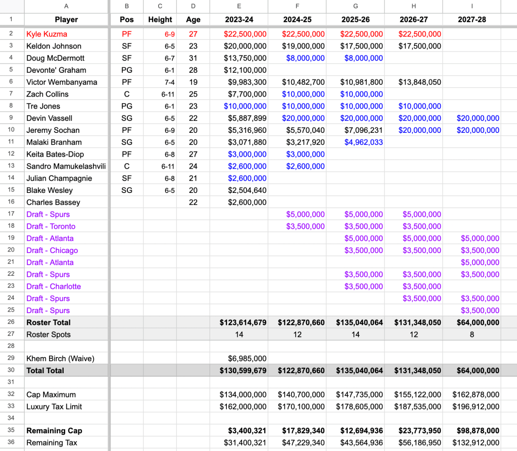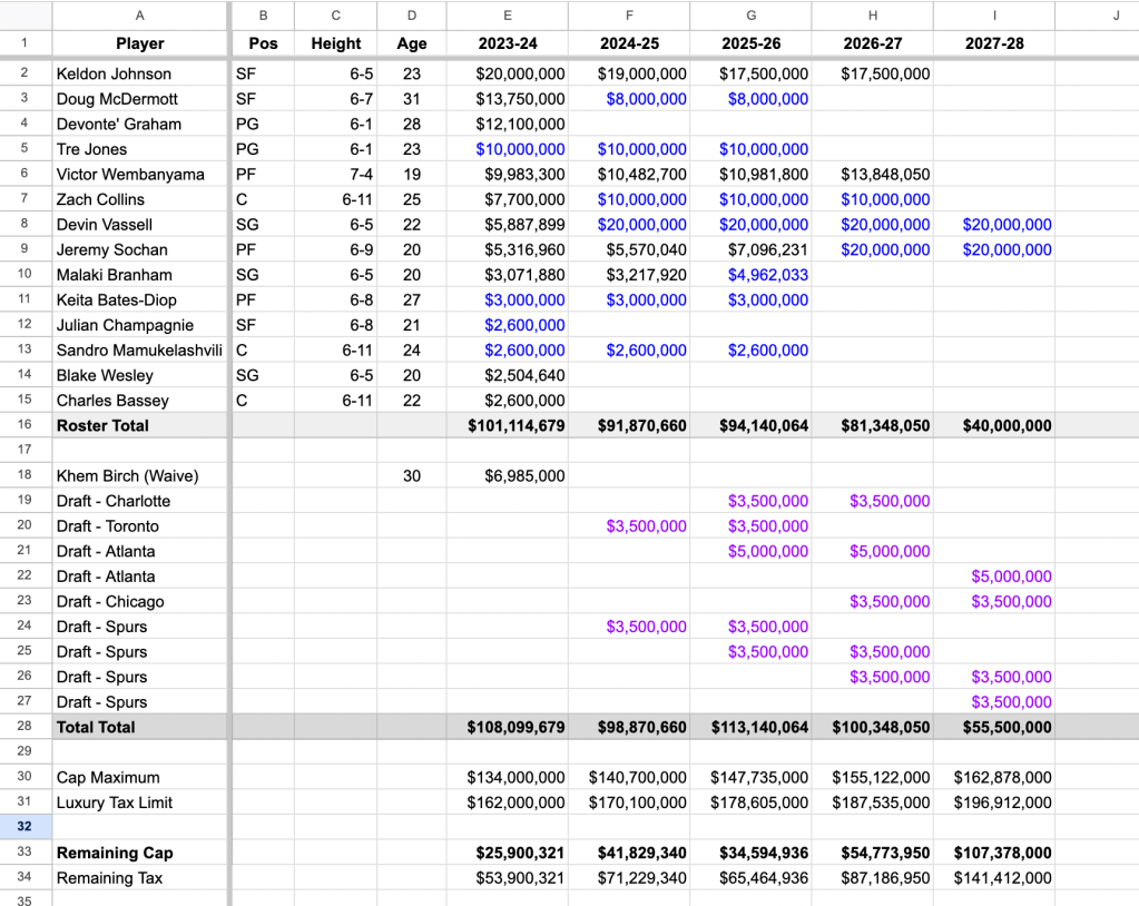 This is with us running Point Sochan and Tre Jones coming off the bench. This assumes we resign Tre Jones, Keita, Mamu, and Champagnie. This roster still has two open spots and about $30mil under the cap.