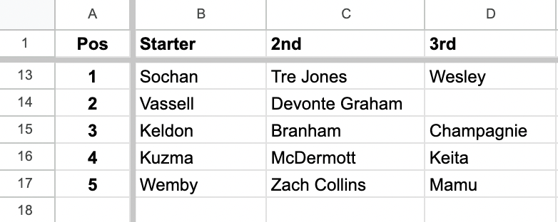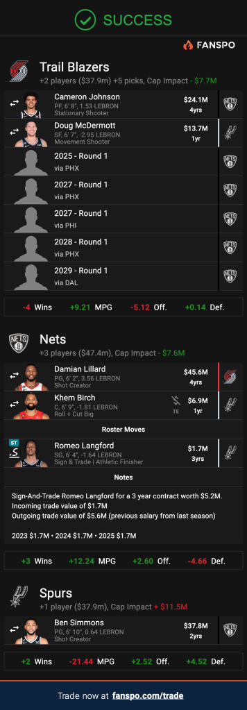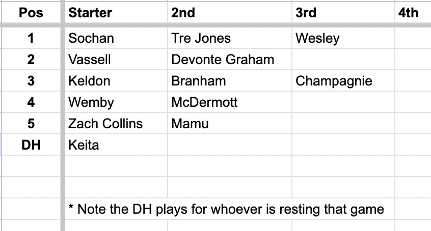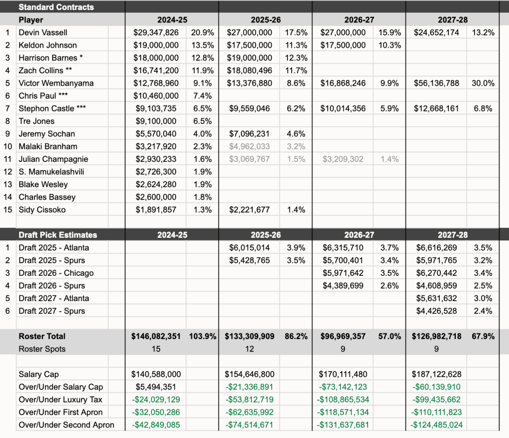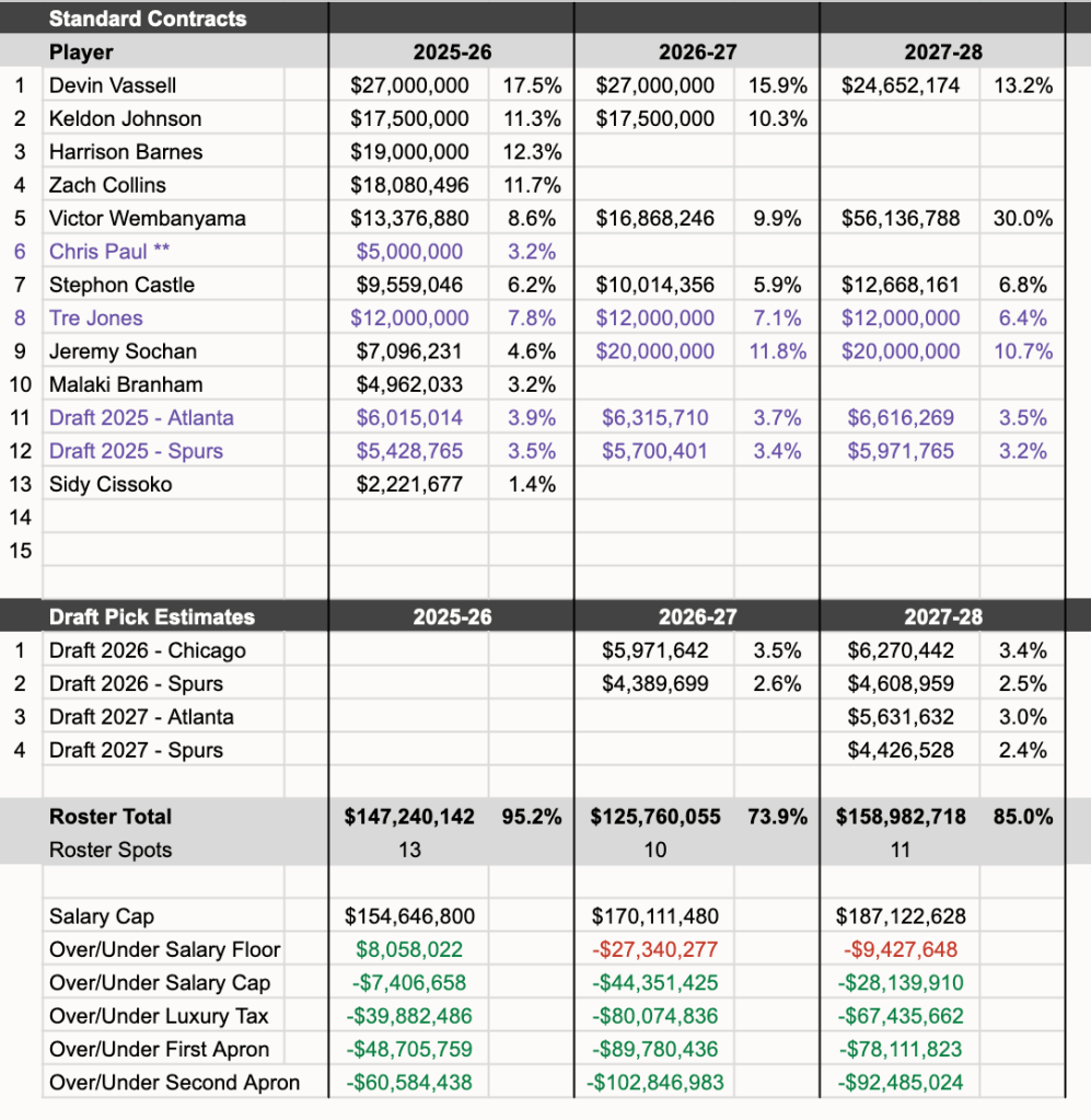 This is with us running Point Sochan and Tre Jones coming off the bench. This assumes we resign Tre Jones, Keita, Mamu, and Champagnie. This roster still has two open spots and about $30mil under the cap.