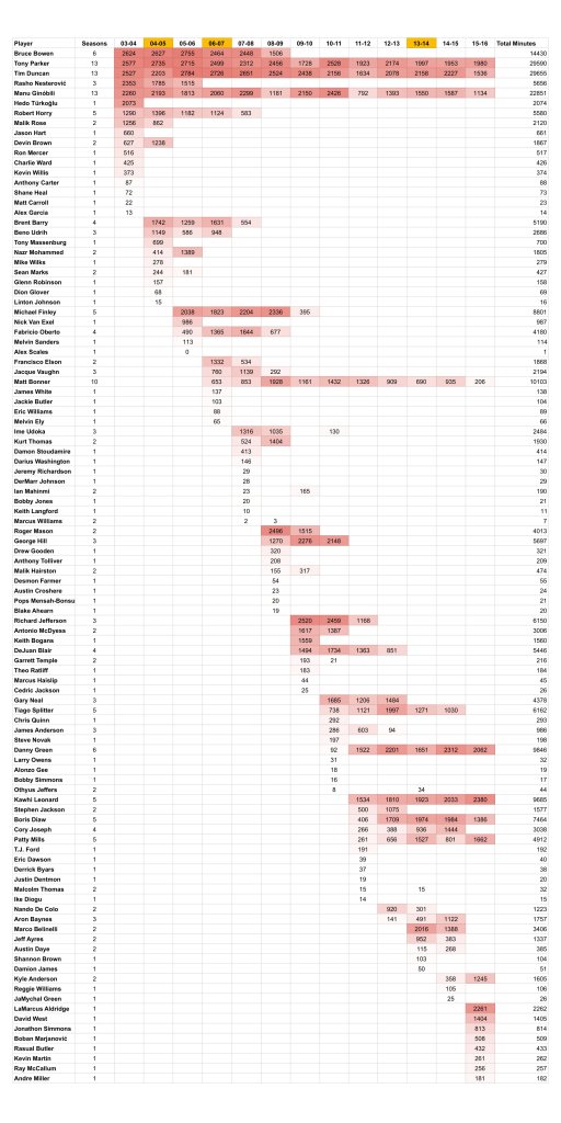 I just wanted to look over some of the Duncan era post-Robinson to see how our teams were constructed and what a typical tenure is for a player. It is about 2.25 seasons per player. If you take out Tony, Tim, and Manu, the average is 1.9 seasons per player. If you only include players that played at least 1000 minutes in a season, the tenure is 3.1 seasons. So basically when we play GM, we should remember that a player is most likely only going to play 2 to 3 years with us.
